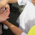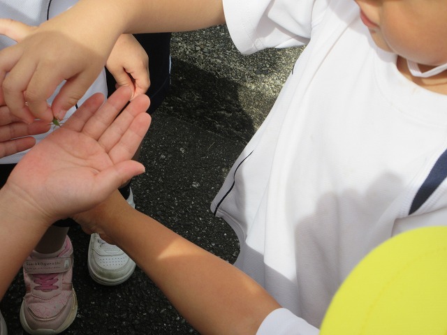 小さなバッタを見つけた先生の周りに集まった子どもたち。