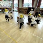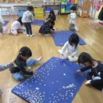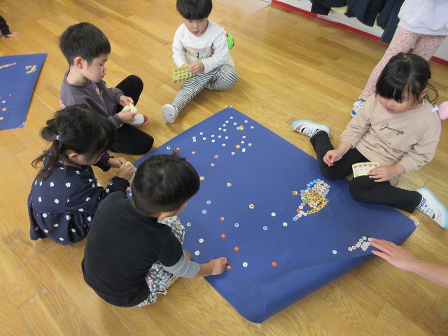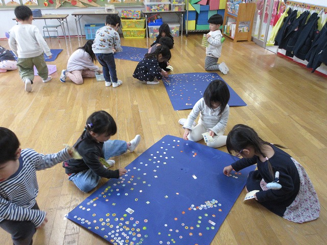 桃組ではグループでシールをたくさん貼って模様やものの形をつくる表現活動中。