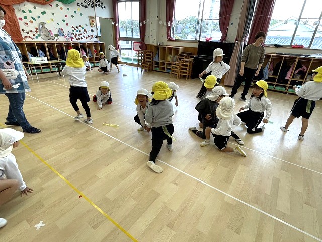 黄組の体育あそびで、マット運動のあと、初めてしっぽとりをしました。