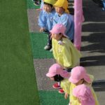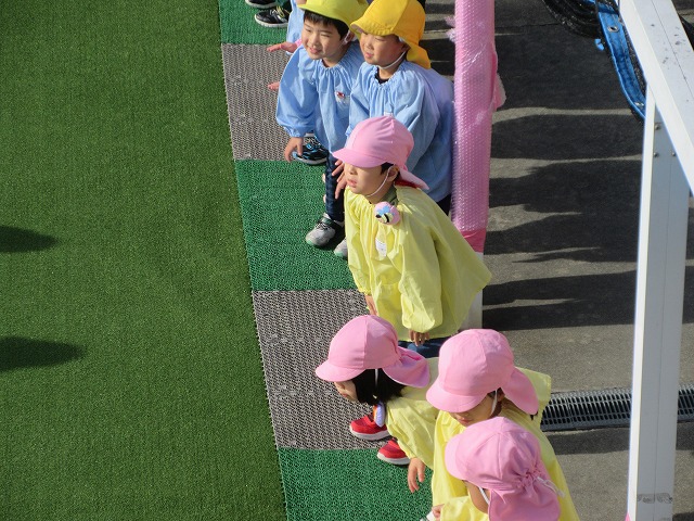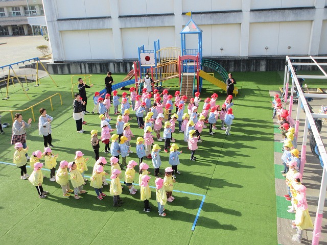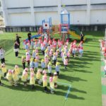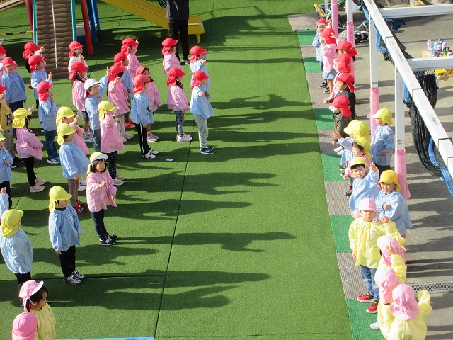 朝一番、青空の下で赤・黄・桃組の子どもたちが元気に体操をしました。