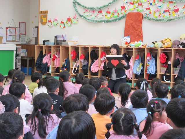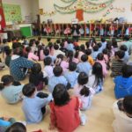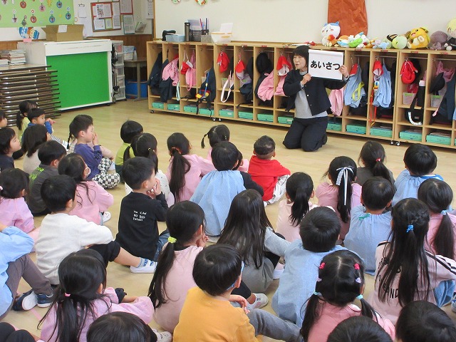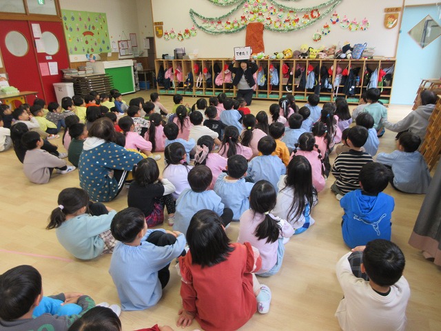 ホールに桃組・黄組・赤組の子どもたちが集まりました。