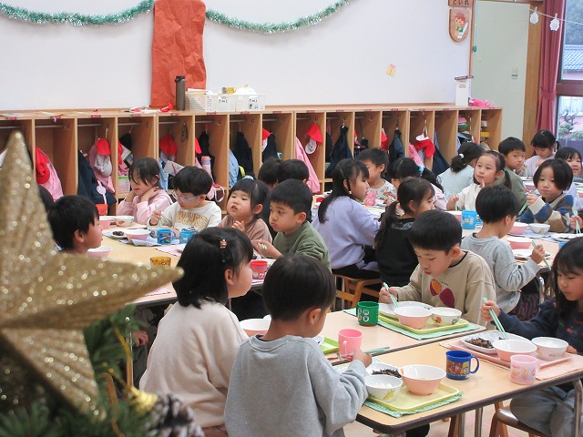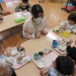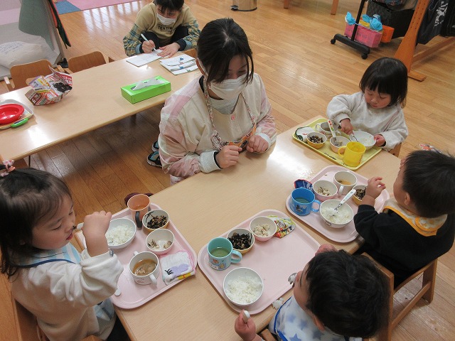 給食の時間の写真は赤組といちご組の様子です。