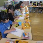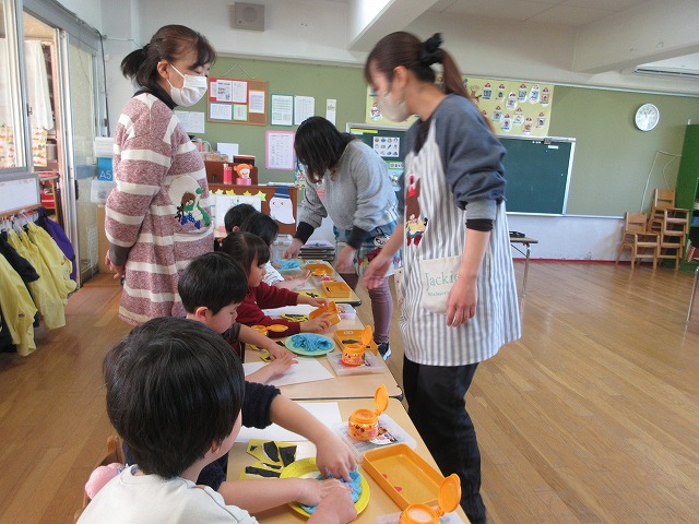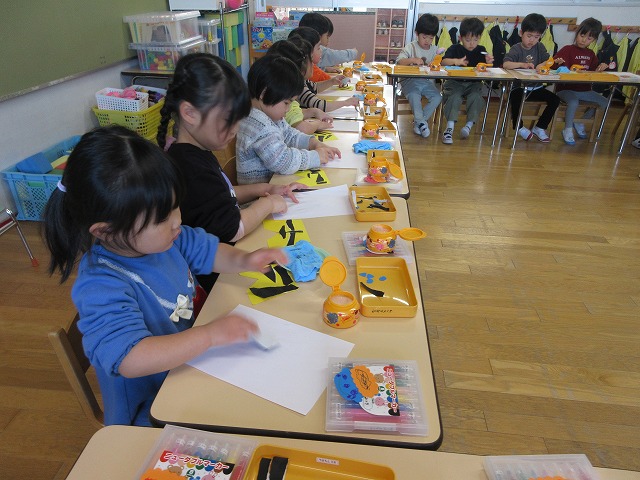 折り紙をちぎって、鬼のパンツに貼り付ける作業もていねいにできていました。