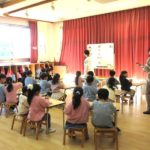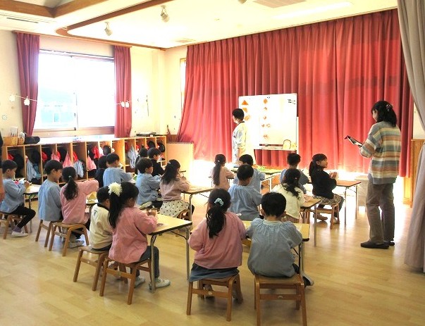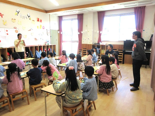 子どもたちが豆入れを折り紙で追っている様子を観ていただきました。