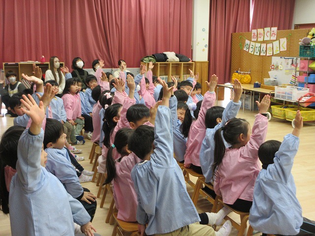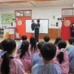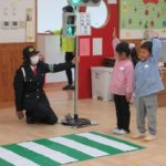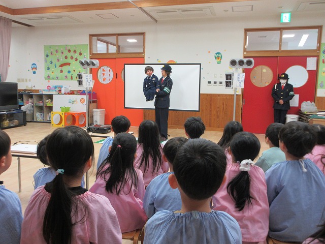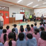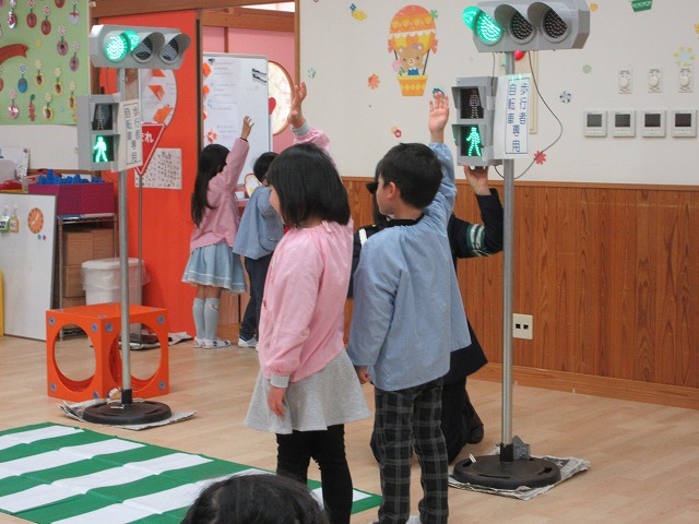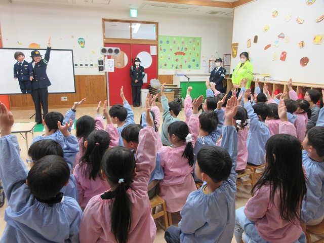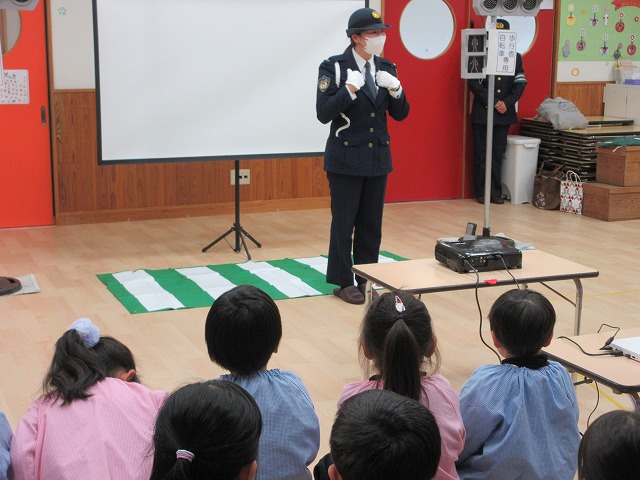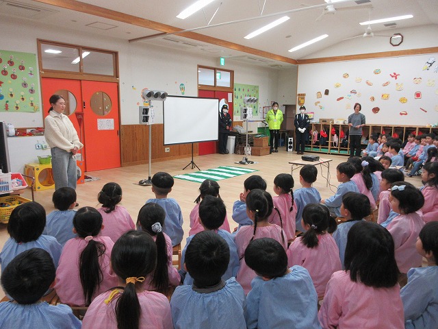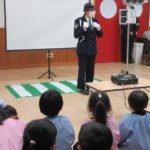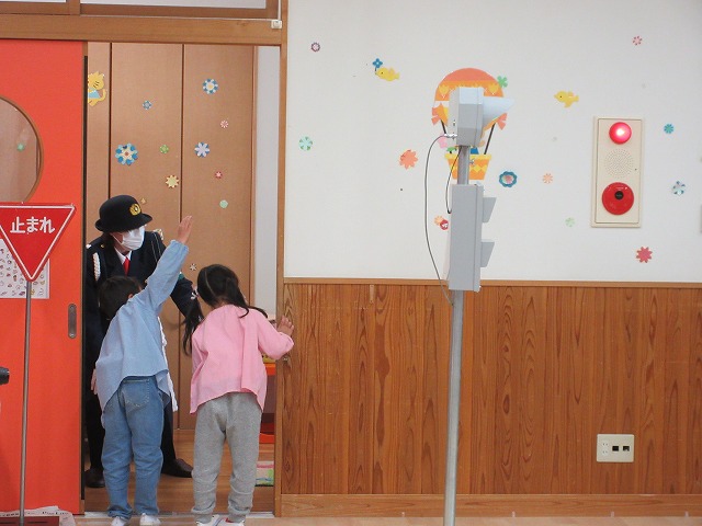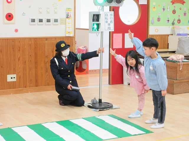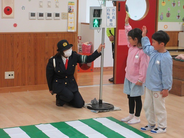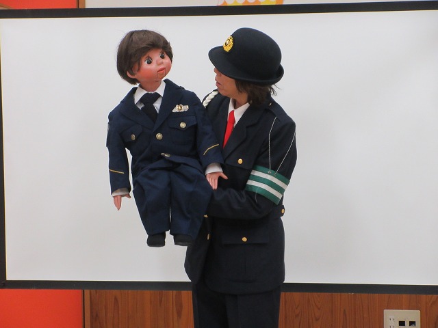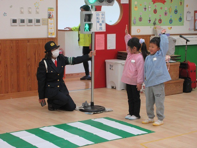 まず、交通安全の3つの約束を「ケンちゃん」に教えてもらいました。
