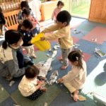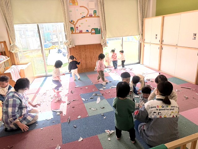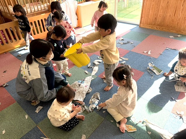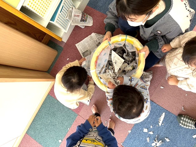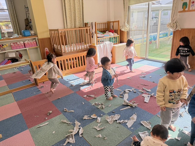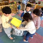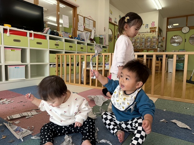 いちご組の子どもたちが新聞紙あそびに挑戦しました。