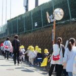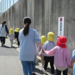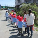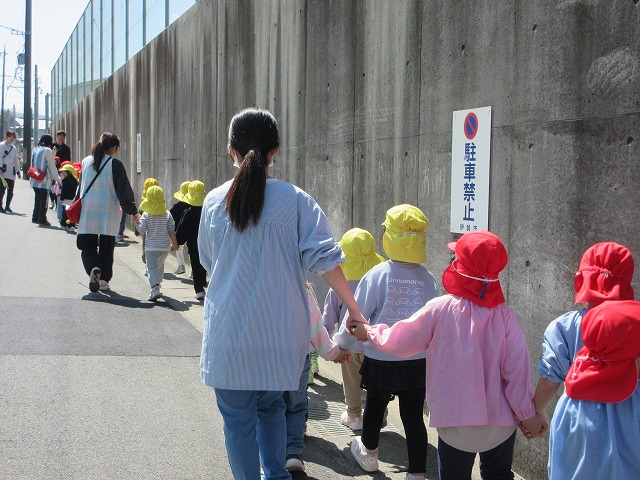 列を乱さずにお友だちと手をつないできちんと歩ける子どもたち。